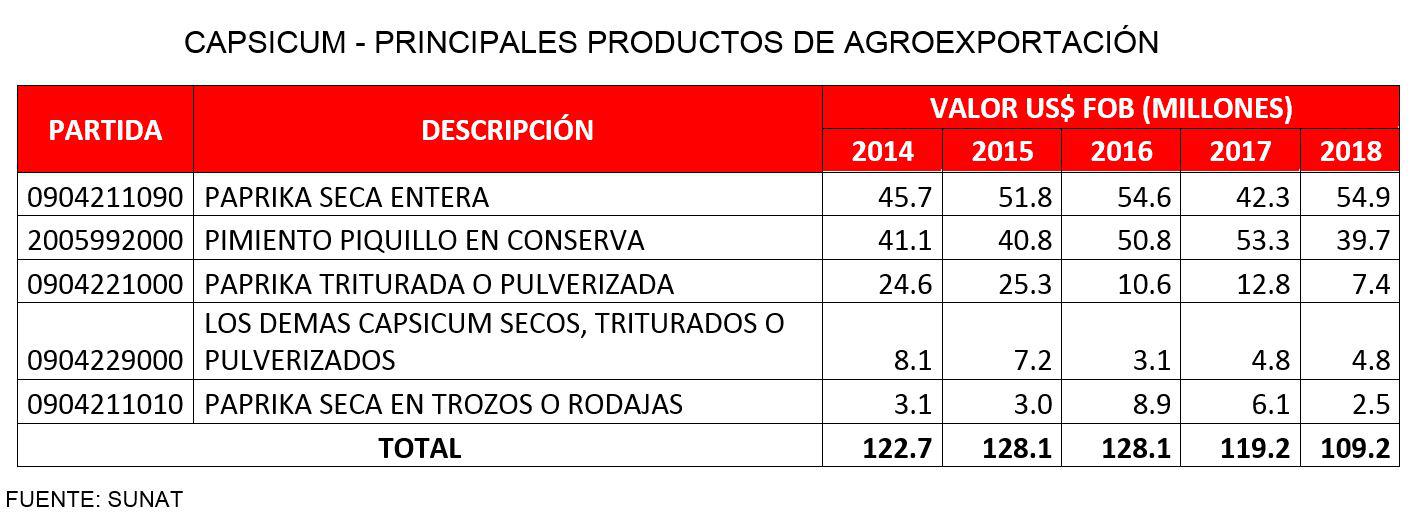 “El Perú exporta principalmente páprika en todas sus formas y conservas de pimiento piquillo. Es importante indicar que este sub sector ha mostrado un estancamiento en las exportaciones en los últimos años”, detallan.