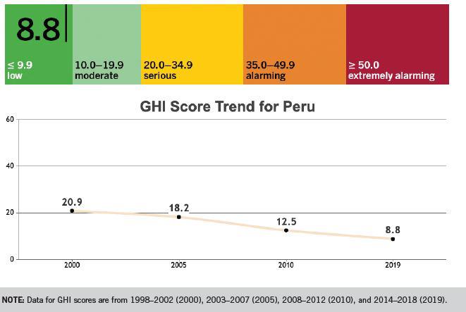Con este último resultado se observa una tendencia en la reducción del riesgo de sufrir hambre en los últimos 19 años, puesto que en el año 2000 la puntuación de Perú fue de 20.9.