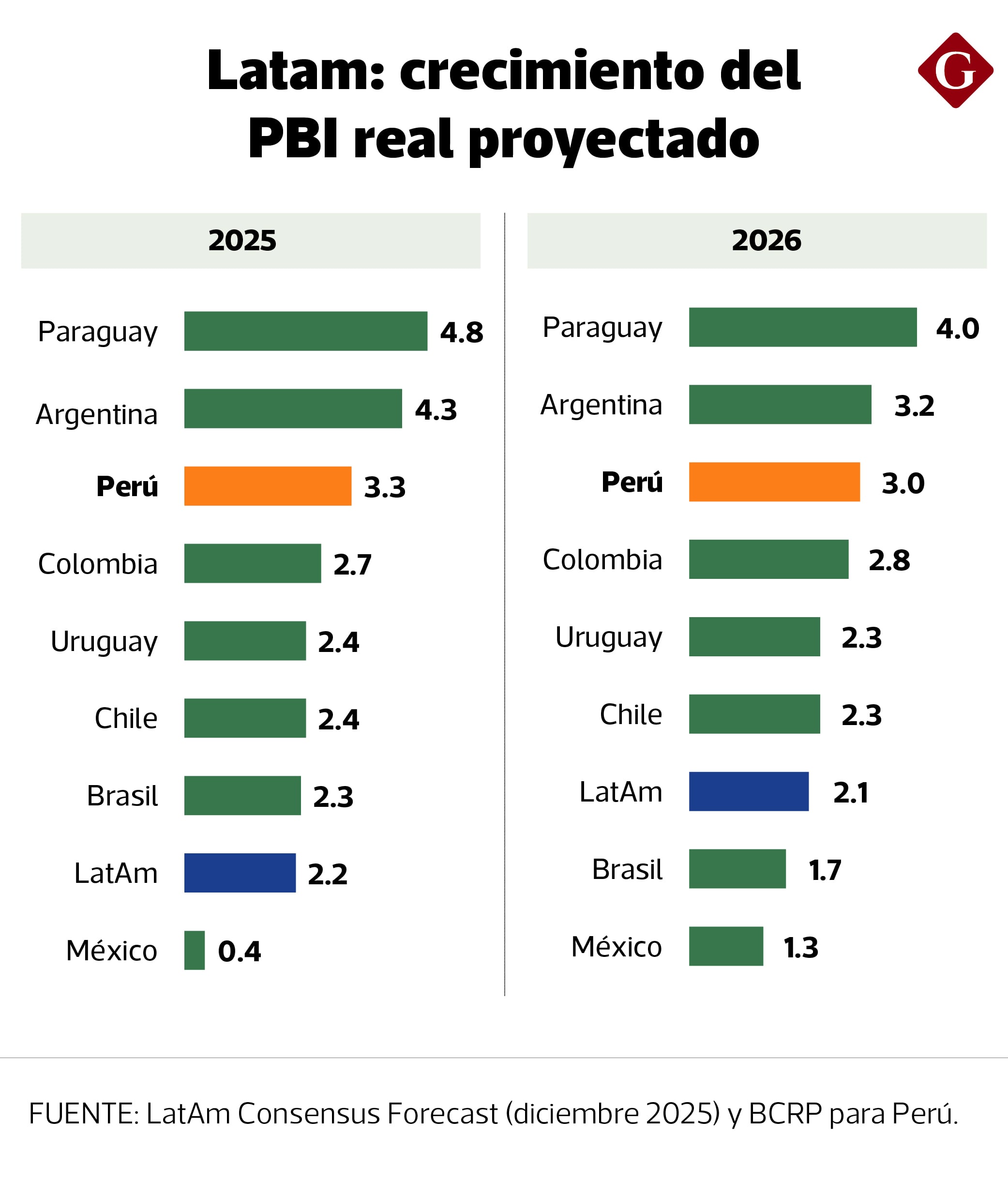 En 2025 y el 2026, precisamente, se ubicaría como la tercera mejor dentro de una selección con la mayoría de países de América Latina. Paraguay lidera este ranking con 4.8% y 4%, mientras que Argentina lo sucede con 4.3% y 3.2%, respectivamente.