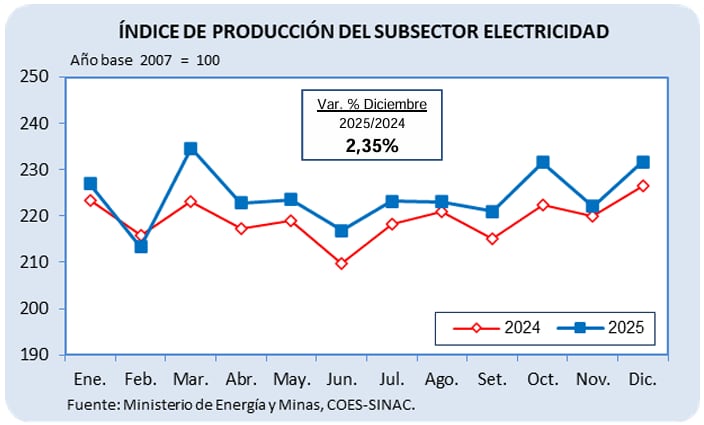 Durante diciembre creció 2.35% ante la generación de energía de origen termoeléctrica (59.82%) y de origen renovable eólica-solar (26.45%). Pero, se redujo la producción de energía de origen hidroeléctrica (-26.39%).