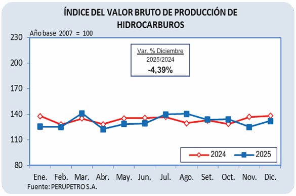 Solo en diciembre, retrocedió 4.39% debido al menor volumen de explotación de petróleo crudo (-16%) y de líquidos de gas natural (-6.3%). La caída pudo ser mayor, pero se compensó por un alza en la producción de gas natural (9.6%).