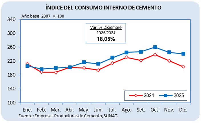 El consumo interno de cemento, indicador clave para medir el avance del sector de construcción, se expandió 7.50% al cierre en el 2025.