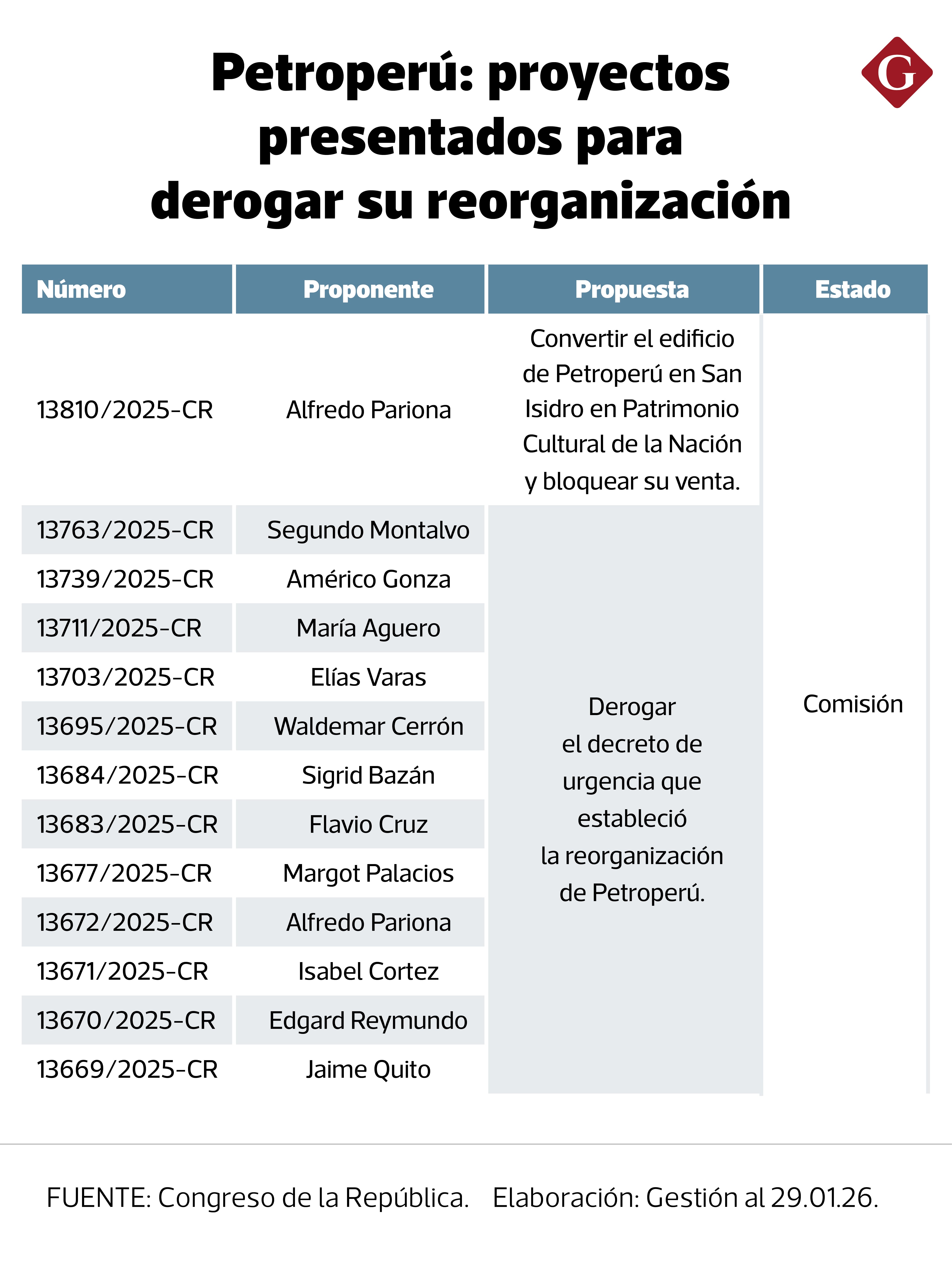 A la fecha, ya son 12 que buscan este fin, cerca de la mitad de todas las iniciativas en torno a la petrolera estatal que este Congreso ha planteado. Una revisión exhaustiva de sus archivos, que hizo Gestión, indica que desde julio del 2021, cuando iniciaron funciones, solo una de esas propuestas se ha vuelto ley. El resto registra nulo avance.
