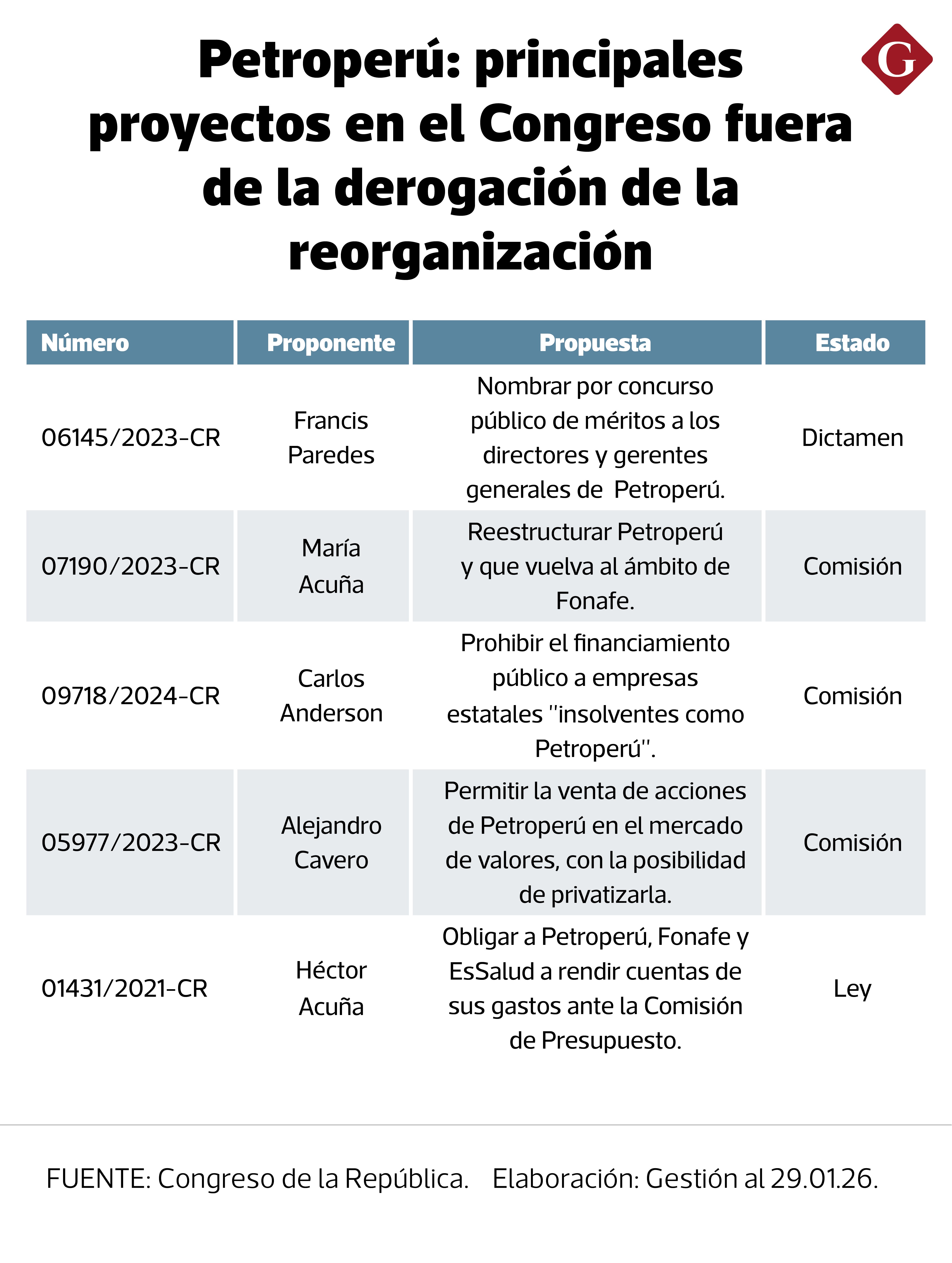 Fuera de ese grupo de 12, hay proyectos de ley que, a criterio de expertos, podrían contribuir positivamente a la reorganización de Petroperú.