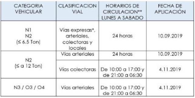 - N1 y N2 (hasta 6.5 toneladas): sin restricciones las 24 horas en todo el Sistema Vial Metropolitano (locales, colectoras, arteriales y expresas). No incluye la vía expresa metropolitana Paseo de la República.