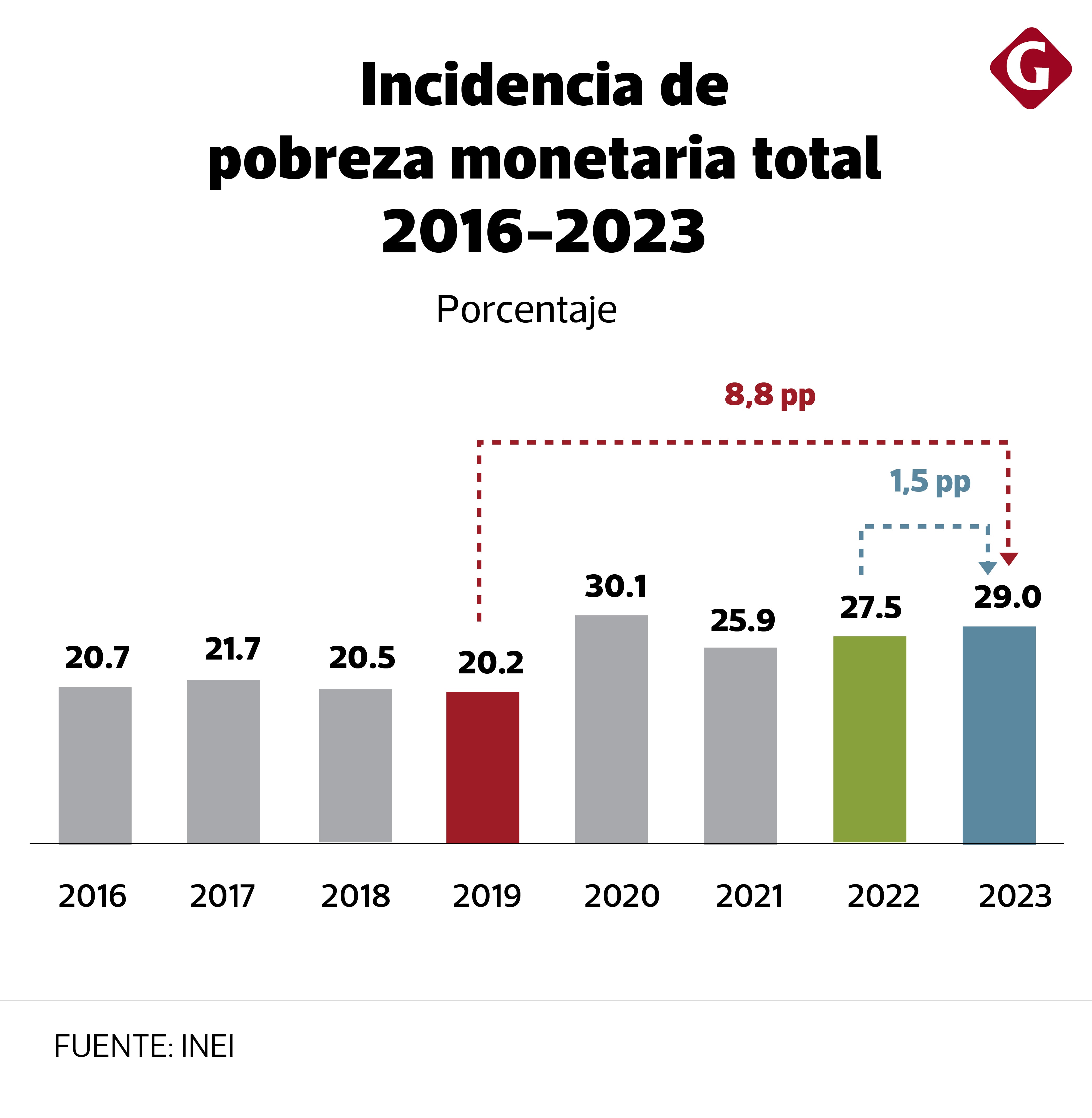 La pobreza monetaria afectó al 29.0% de la población peruana en 2023, marcando un incremento de 1.5 puntos porcentuales (pp) en comparación con el 2022. Este aumento se atribuye a una serie de eventos adversos que impactaron negativamente la economía nacional, resultando en una contracción del Producto Bruto Interno (PBI) de -0.6% el año pasado.