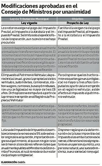 Uno de ellos propone modificar la Ley de Tributación Municipal, con cinco cambios para ampliar la base tributaria, simplificando la determinación de los tributos, y optimizando mecanismos de cobranza (ver cuadro).