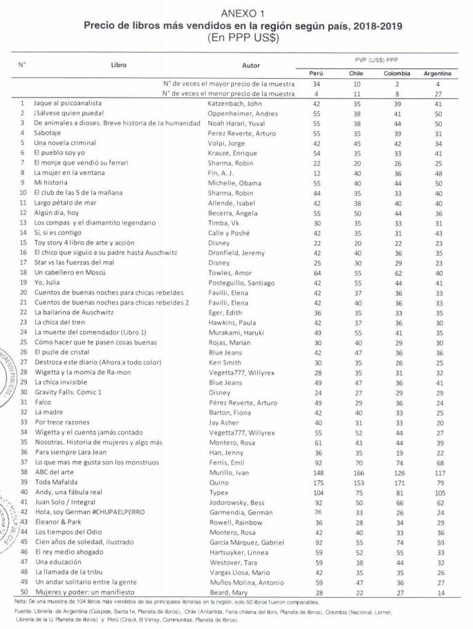 Según detalla el informe enviado por el MEF al Congreso en el marco del debate de la nueva ley del libro, se señala que de los 50 libros más vendidos, el 68% de ellos tiene el precio más caro entre Perú, Colombia, Argentina y Chile.