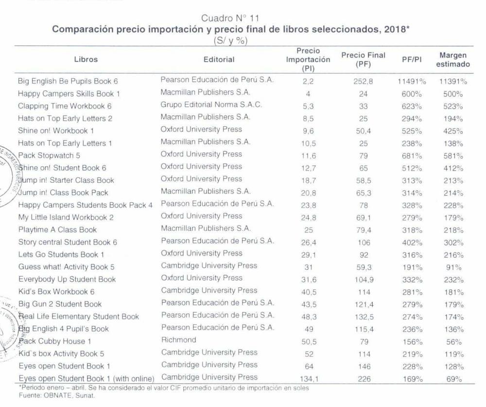 Así, por ejemplo, el libro Big English Be Pupils Book 6, importado por la editorial Pearson Educación de Perú S.A., tiene un precio de importación de S/ 2.2. Sin embargo, es vendido en el mercado a un precio final de S/ 252.8. Esto arroja un margen de ganancia de 11,391%.