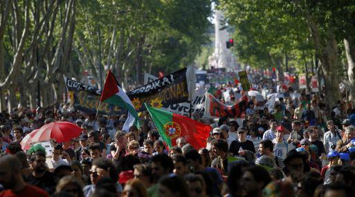 Durante una multitudinaria marcha pacífica por la Avenida de la Libertad los participantes llevaban pancartas en las que exigían el fin de la austeridad y la renuncia del gobierno de coalición de centro derecha.