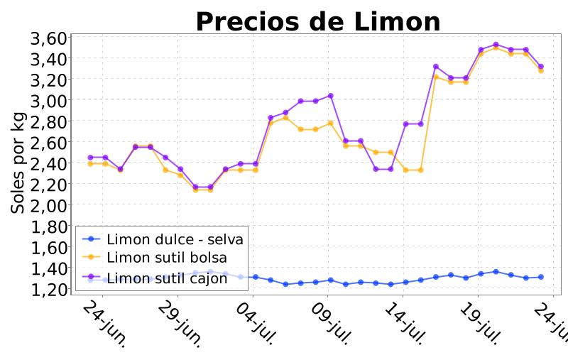 Según vendedores del Mercado Palermo, los productos que mas han subido su valor son el limón, cebolla y palta. El primero llegó a costar el día de ayer, lunes 25 de julio, S/ 7 el kilo, cuando normalmente su valor oscila entre S/ 4 y S/ 4.50.