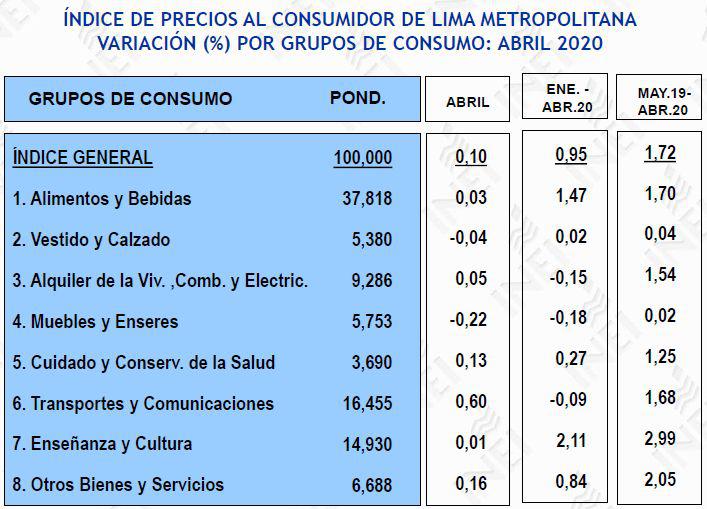 El Índice de Precios al Consumidor (IPC) de Lima Metropolitana se incrementó en 0.10% en el mes de abril de 2020, anunció el Instituto Nacional de Estadística e Informática (INEI).