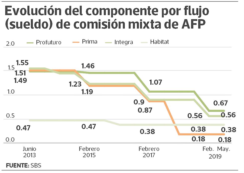 La otra comisión. Alrededor de 1.8 millones de afiliados de AFP optaron, desde el 2013, por quedarse en la comisión por flujo (cobro único sobre el sueldo mensual del trabajador). A estas personas, las AFP les cobran hoy comisiones de entre 1.47% y 1.69%. Desde abril del 2014 no ha habido ninguna reducción en el nivel de estos precios, que están fuera de las licitaciones.