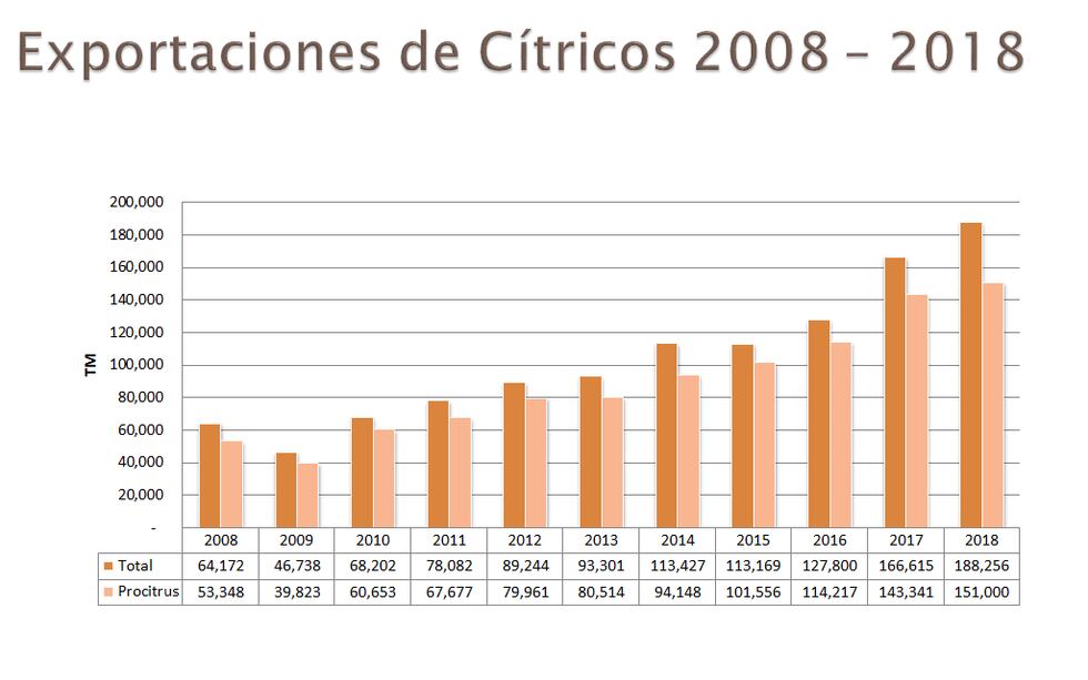 Las exportaciones de cítricos en general sumaron 188,256 toneladas métricas en el 2018 y rozaron los US$ 200'000,000, lo que representa un crecimiento de 22% con respecto al 2017, año en que se exportaron 166,615 toneladas. “En el 2019 vamos a superar los 200 millones de dólares”, expresó Del Castillo.