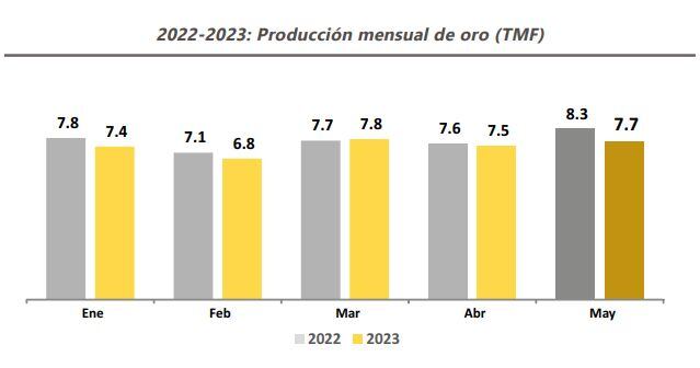 Solo en mayo de este año, la producción aurífera logró 7,687,825 gramos finos, una contracción de 7.4% respecto al mismo mes de 2022 (8,299,460 gramos finos), como resultado de menores niveles de producción de Compañía Minera Poderosa (-28.4%), Compañía de Minas Buenaventura (-23.6%) y Minera Yanacocha (-12.2%).