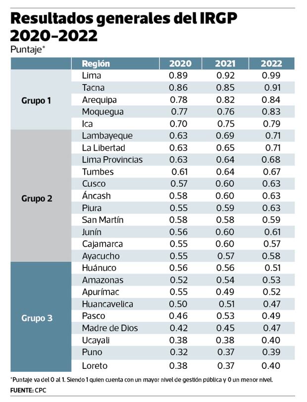 Se observa que, nueve de las 10 regiones con el puntaje más alto corresponden a regiones costeras (Lima, Tacna, Arequipa, Moquegua, Ica, Lambayeque, La Libertad, Lima provincias, Tumbes), siendo Lima la que lidera este indicador y que además mejora respecto al IRGP anterior.
