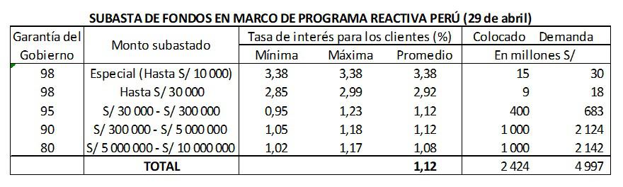 Agregó que hasta la fecha se han colocado repos con garantía del gobierno nacional en tres subastas por S/ 14,382 millones, a una tasa promedio de 1.08% para los clientes de las entidades financieras.