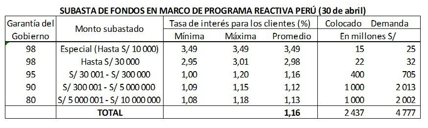 Hasta la fecha se han colocado repos con garantía del gobierno nacional en cinco subastas por S/ 16,819 millones, a una tasa promedio de 1.09% para los clientes de las entidades financieras.