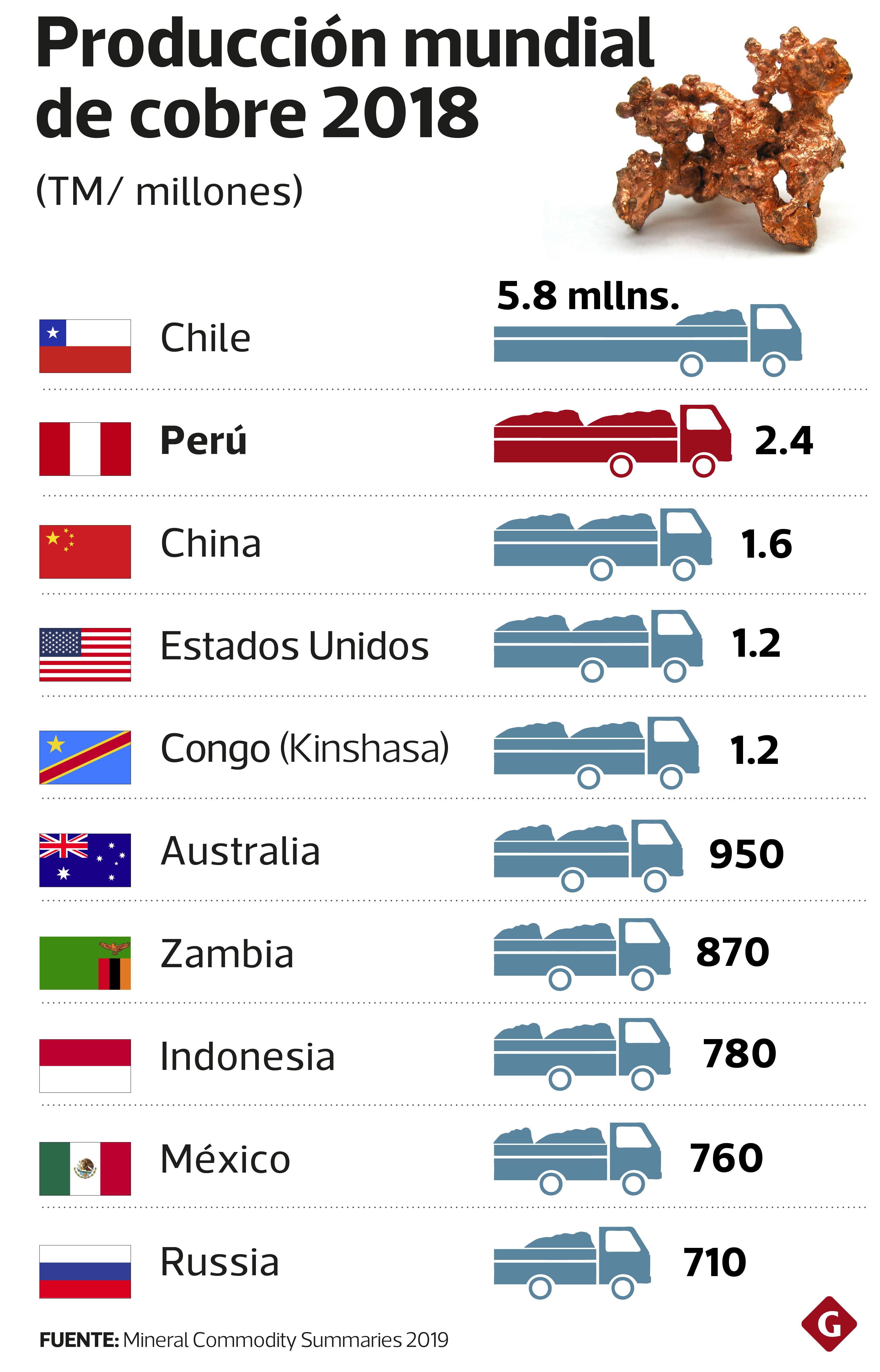 Desde hace unos seis años Perú busca subir al podio y ser el primer productor mundial de cobre desplazando a Chile que actualmente ostenta este puesto con sus 5.8 millones de toneladas métricas del metal rojo.