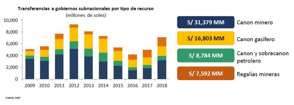 Entre los años 2009 y 2018, el nivel de ejecución promedio de los recursos presupuestados de canon, sobrecanon y regalías que aportaron la minería y los hidrocarburos, alcanzó el 66% en promedio por el Gobierno Nacional y los gobiernos regionales y locales, pero éste año, el nivel de ejecución se ha ralentizado.