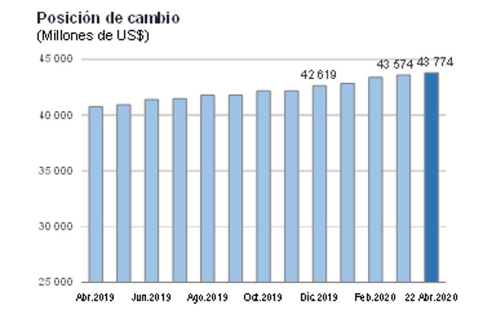 Dentro de los componentes de las reservas internacionales, la posición de cambio al 22 de abril ascendió a US$ 43,774 millones, monto mayor en US$ 200 millones frente al cierre de marzo y superior en US$ 1,155 millones con relación a fines de diciembre de 2019.