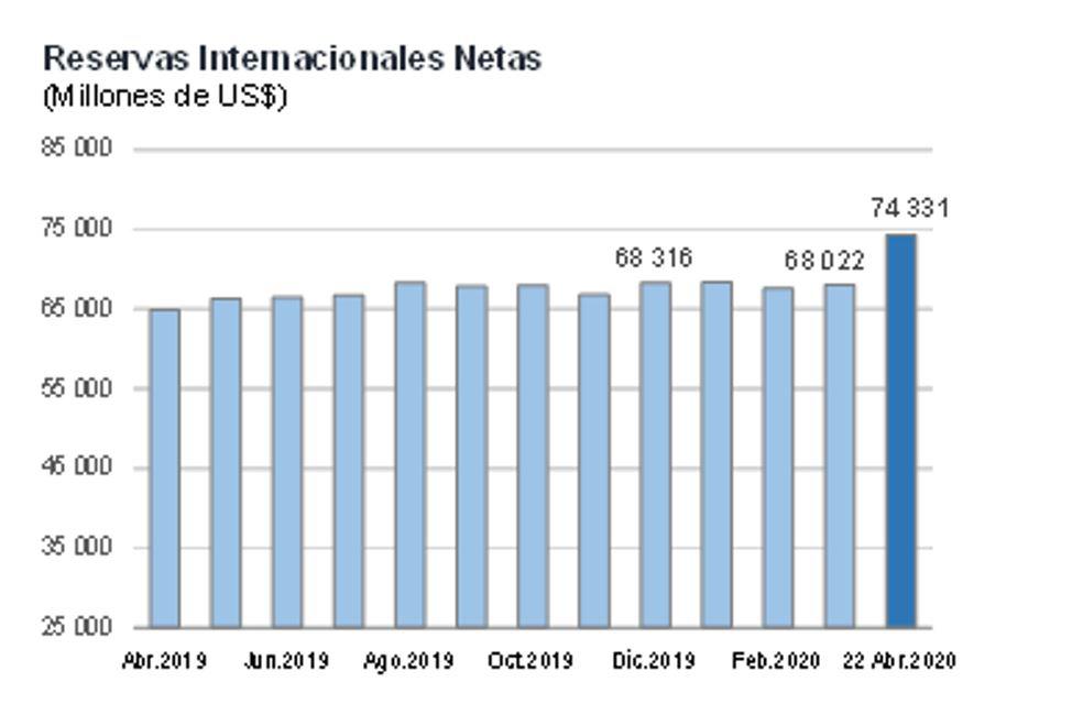 Las Reservas Internacionales Netas (RIN) subieron a US$ 74,331 millones al 22 de abril, una cifra histórica. La cifra actual es superior en US$ 4,010 millones al récord anterior del 15 de abril, cuando la RIN alcanzaron los US$ 70,341 millones.