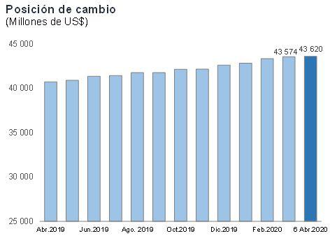 Dentro de los componentes de las reservas internacionales, la Posición de Cambio al 6 de abril ascendió a US$ 43,620 millones, monto mayor en US$ 46 millones con relación al cierre de marzo pasado y superior en US$ 1,001 millones al de fines de diciembre del 2019.