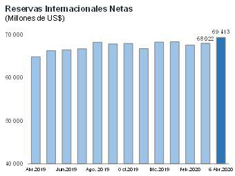 Las reservas internacionales netas (RIN) se incrementaron en US$ 1,391 millones en los seis primeros días de abril de este año y ascendieron a US$ 69,413 millones al lunes 6 de dicho mes.