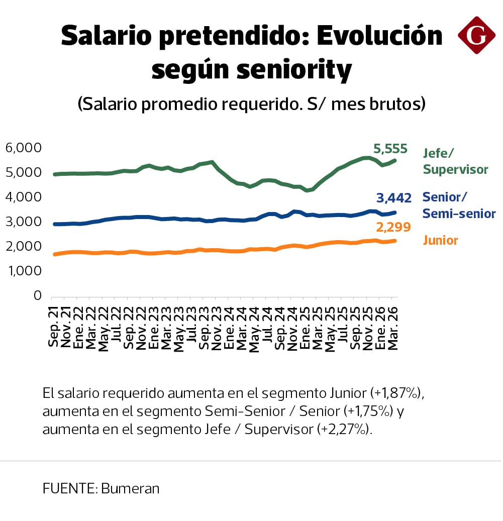 En tanto, el salario requerido para los puestos semisenior y senior es de S/ 3,442; y el de los puestos junior es S/ 2,299.