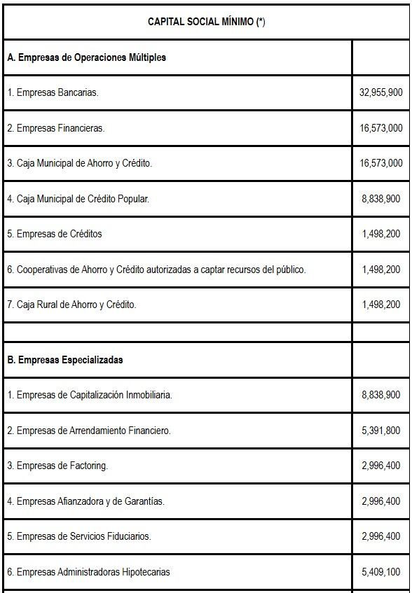 La Superintendencia de Banca, Seguros y AFP (SBS) dispuso la actualización del capital social mínimo para las empresas financieras de operaciones múltiples y especializadas, así como bancos de inversión, compañías de seguros y servicios complementarios.