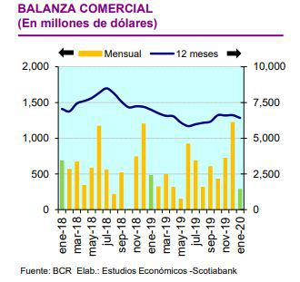 La Balanza Comercial (BC) registró un superávit de US$ 283 millones en enero, el monto más bajo desde mayo del 2019 y casi la mitad de lo registrado en el mismo mes del año anterior, según el último Reporte Semanal de Scotiabank en base a las cifras del Banco Central de Reserva (BCR).