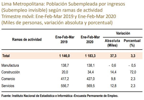 Salvo en manufactura, el subempleo visible se incrementó en construcción (6,700 más), comercio (21,700 más) y servicios (48,800 más). Y en estos tres sectores, también se incrementó el subempleo invisible (Ver tabla).
