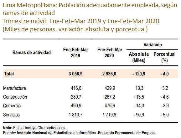 En los tres primeros meses del año se perdieron 120,900 empleos adecuados en Lima Metropolitana, respecto a similar periodo del 2019, según la información del INEI. Es decir, los puestos de trabajo en los que se laboran 35 o más horas a la semana y se reciben ingresos por encima del ingreso mínimo referencial cayeron 4%.