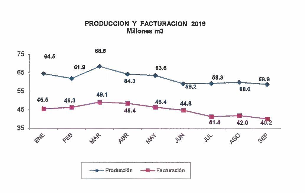En cuanto al volumen de agua potable factura, a setiembre de 2019 alcanzó los 404.1 millones de m3, mayo a lo facturado a setiembre de 2018 (398.9 millones de m3).