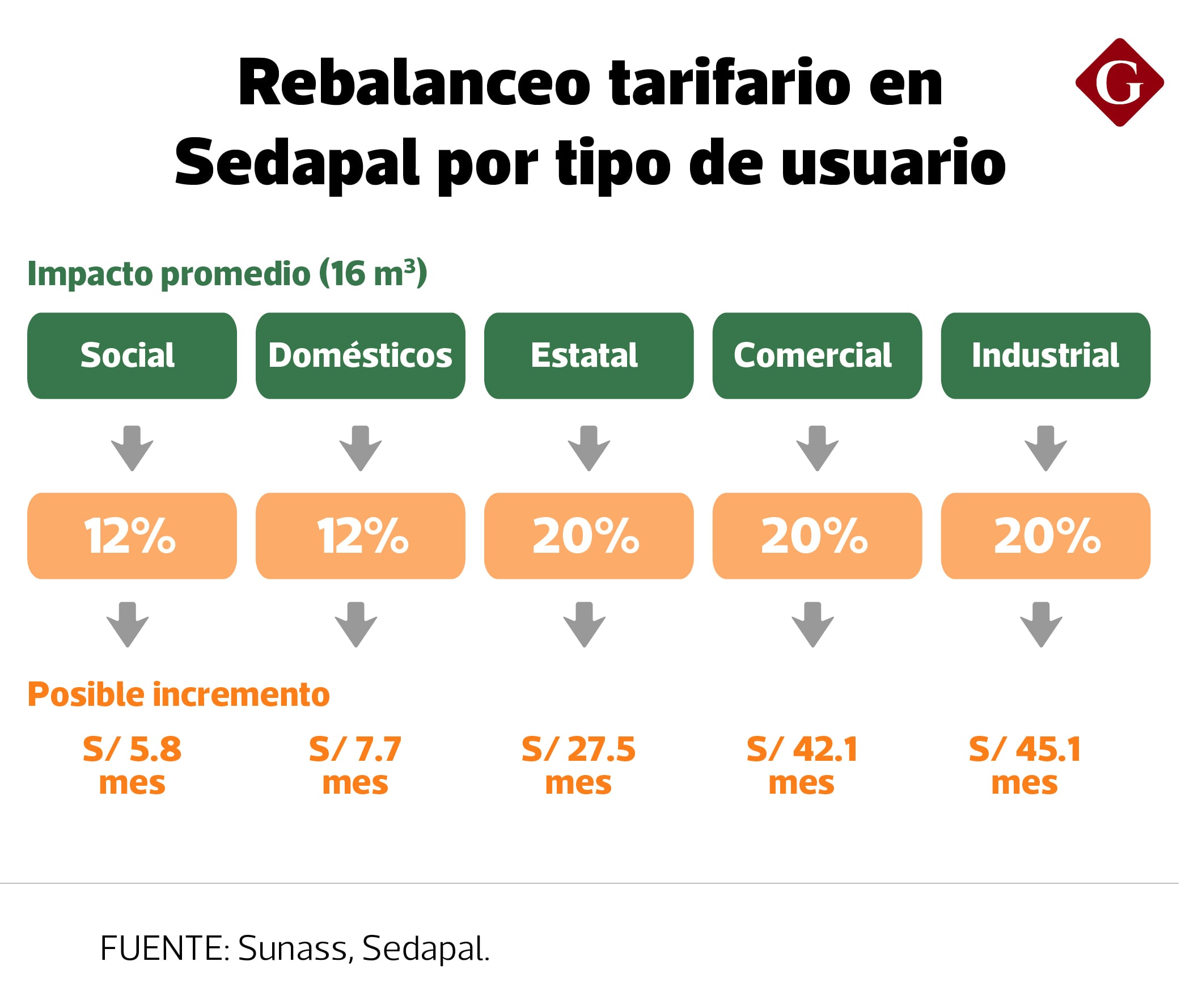Estos son social, domésticos, el Estado, comercios e industria. Son estos dos últimos grupos los que serán más afectados por el aumento tarifario, ya que pagarán S/ 42.1 y S/ 45.1 más por mes a partir de un consumo promedio de 16 metros cúbicos (m3) de agua potable.