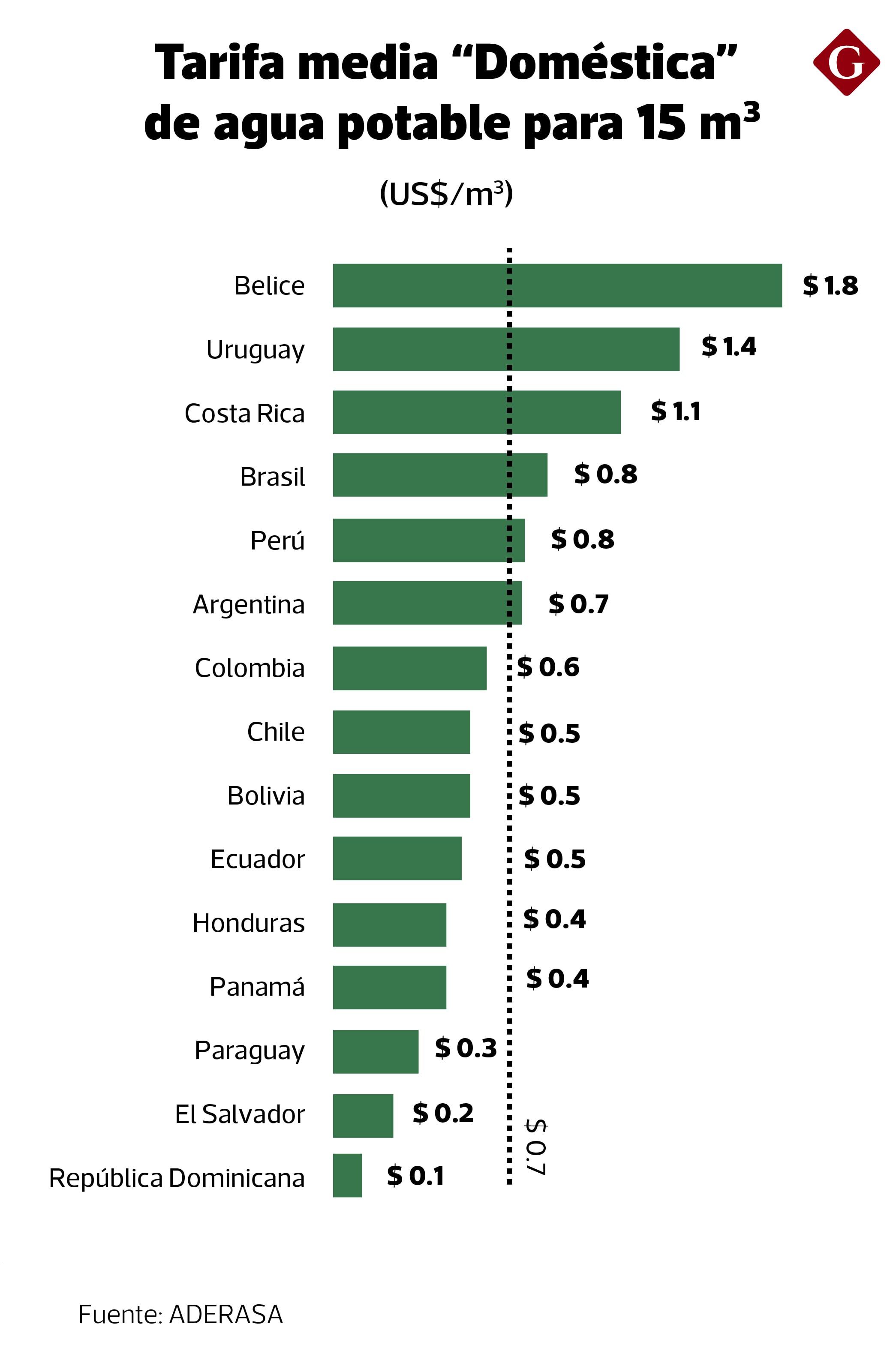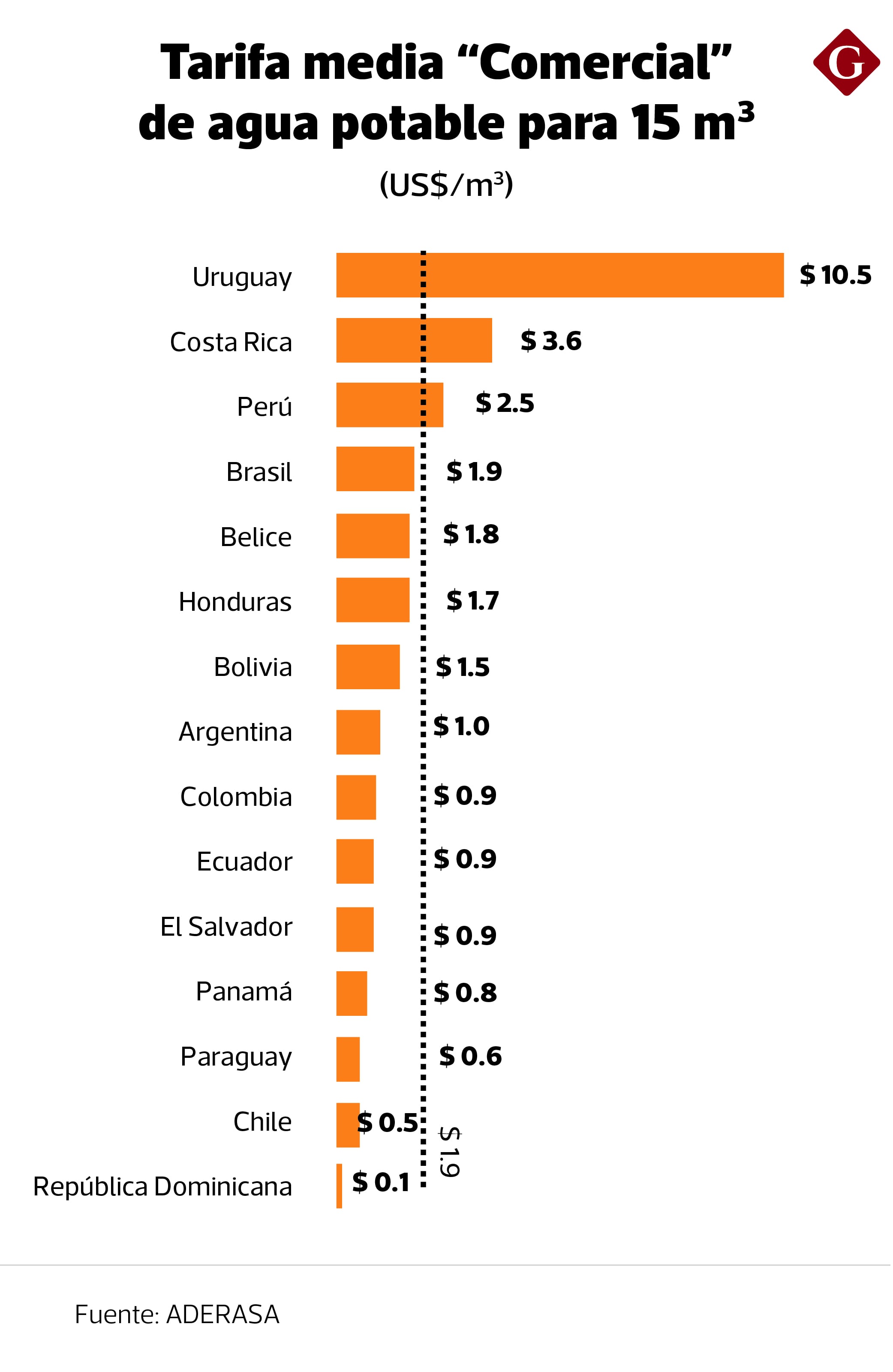 Según el estudio, que mide la tarifa media comercial de agua potable para 15 m3, Perú tiene la tercera tasa más alta y está encima del promedio regional (US$ 1.9/m3), solo detrás de Uruguay y Costa Rica. En el caso de domésticos, está a mitad de tabla, en la quinta posición.