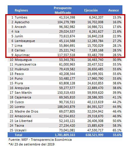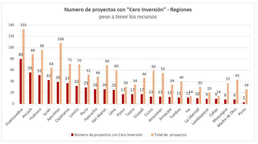 A continuación, el ranking de las regiones con proyectos que tiene cero de inversión, a pesar de contar con el presupuesto.
