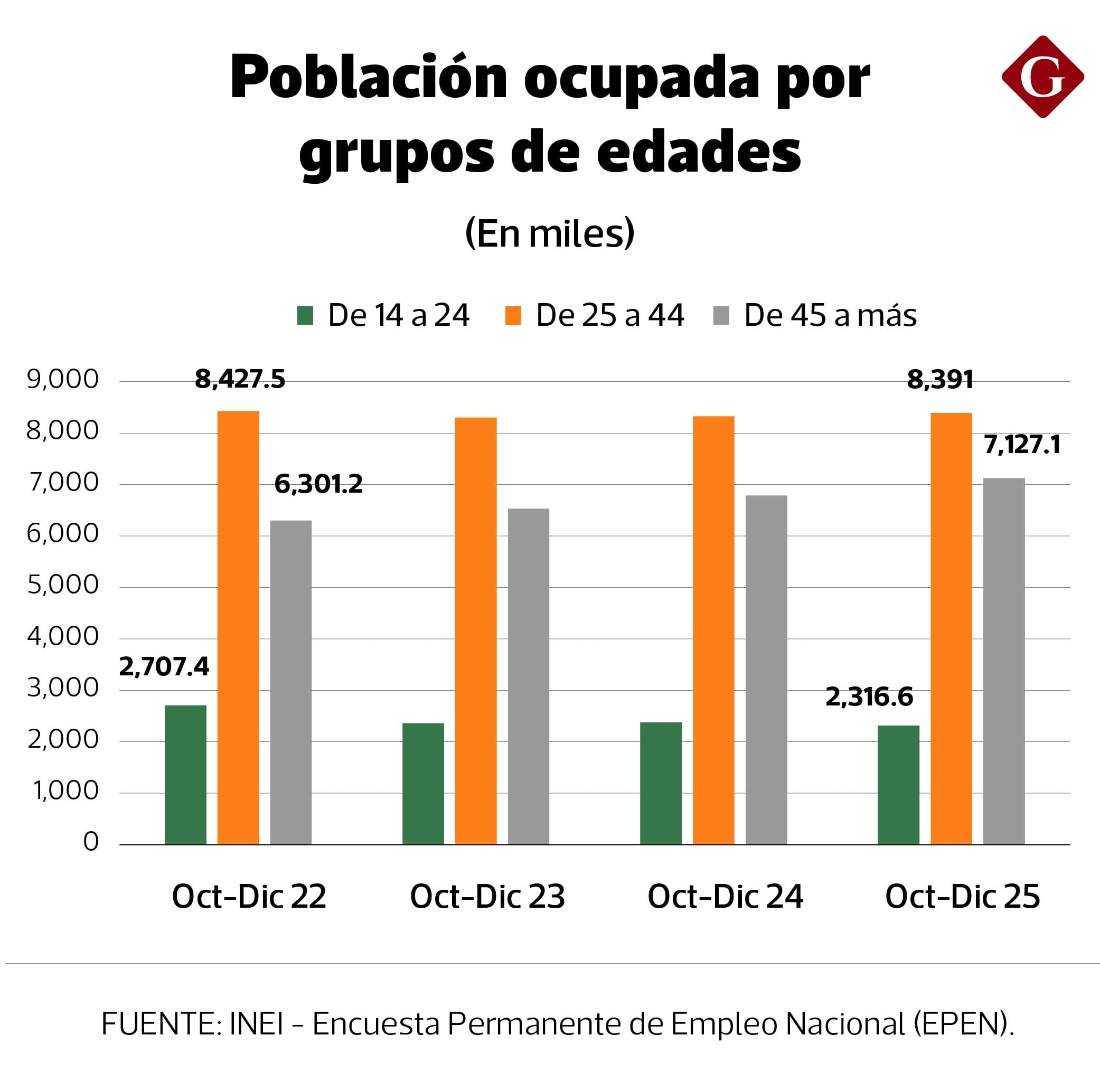 De hecho, en el cuarto trimestre del 2025, la población ocupada de los grupos de 25 a 44 y de 45 a más presentaron aumentos de 0.7% y 4.9%, respectivamente. Sin embargo, entre los más jóvenes la caída fue más de 2.5%.