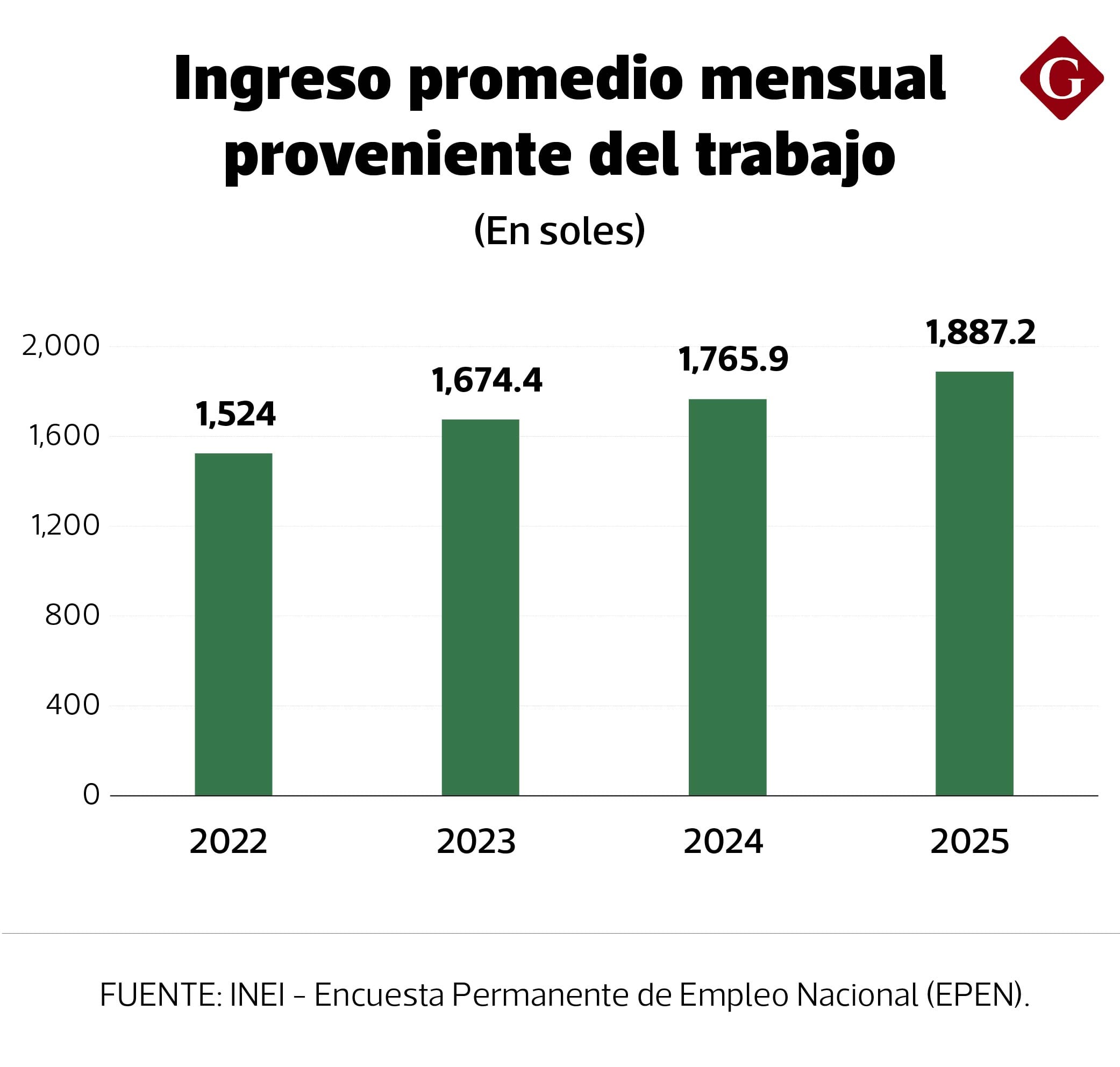 Uno de los datos destacados del mercado laboral nacional en 2025 fue el avance en los ingresos promedio mensual provenientes del trabajo. Así, el informe mostró que ascendió a los S/ 1,887.2, un incremento de 6.9% en términos nominales, equivalentes a más de S/ 121.