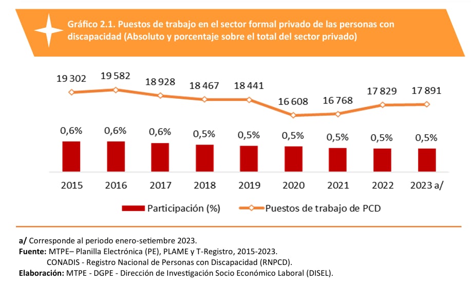 De acuerdo con la data de Conadis a 2023, el Registro Nacional de la Persona con Discapacidad (RNPCD) contenía información de un total de 434,692 personas registradas en ese año, donde después de un proceso de consistencia de los números de documentos de identidad y de la disponibilidad de datos sobre limitaciones que tenían de estas personas (tipo y gravedad), el reporte trabajó finalmente con 433,515 registros de personas con discapacidad con inscripción vigente.