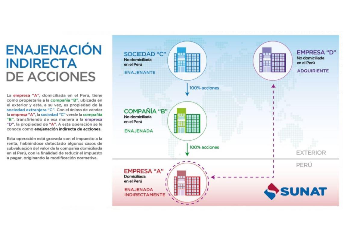 Mediante el mecanismo de enajenación indirecta, una empresa del exterior “C”, propietaria de una compañía peruana “A”, a través de otra sociedad ubicada en el exterior “B”, puede vender sus acciones en “B” a otra sociedad “D”, transfiriendo indirectamente a la compañía peruana.