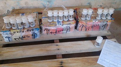 Con la presencia del conductor del ómnibus se abrió el bulto, encontrando en su interior 30 frascos de plástico conteniendo igual cantidad de kilos de mercurio metálico al 99.99%.