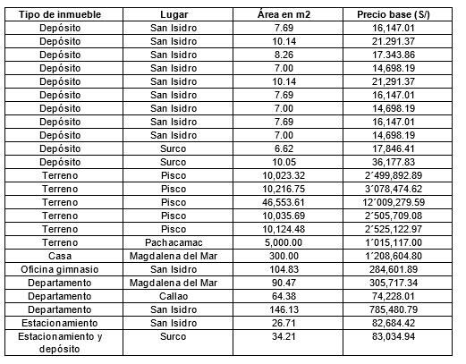 Entre los bienes a rematar destacan 11 depósitos de hasta 10.14 metros cuadrados, seis terrenos de hasta 46 mil metros cuadrados, tres departamentos, una casa de dos pisos, una oficina gimnasio, dos oficinas, dos estacionamientos, una sala de usos múltiples entre otros.