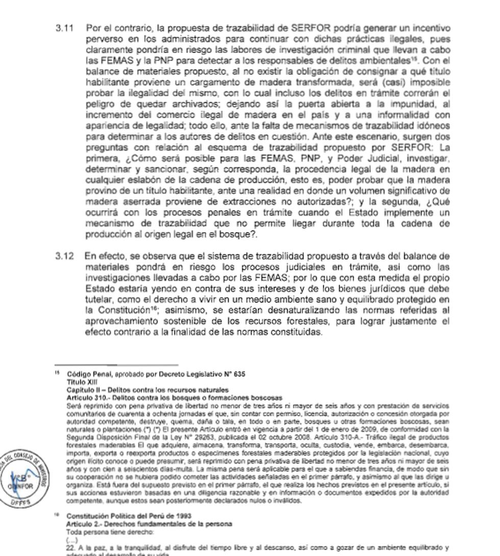En la respuesta del Osinfor, entonces bajo la gestión de Salazar, se evidencia una alarma similar. “El nuevo formato plantea trabajar los volúmenes a través del balance de materiales (ingresos y salida de volúmenes), lo cual no permite realizar la trazabilidad y demostrar el origen del producto forestal”, indica el Osinfor en el Oficio N° 058-2018, que contiene el informe N° 027-2018, además de considerar que la resolución del Serfor que aprueba este cambio podría hacer peligrar los procesos fiscales y judiciales en torno a la tala ilegal y “es susceptible de una acción popular, por vulnerar la Ley 29763 (Ley Forestal)”.