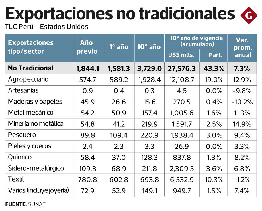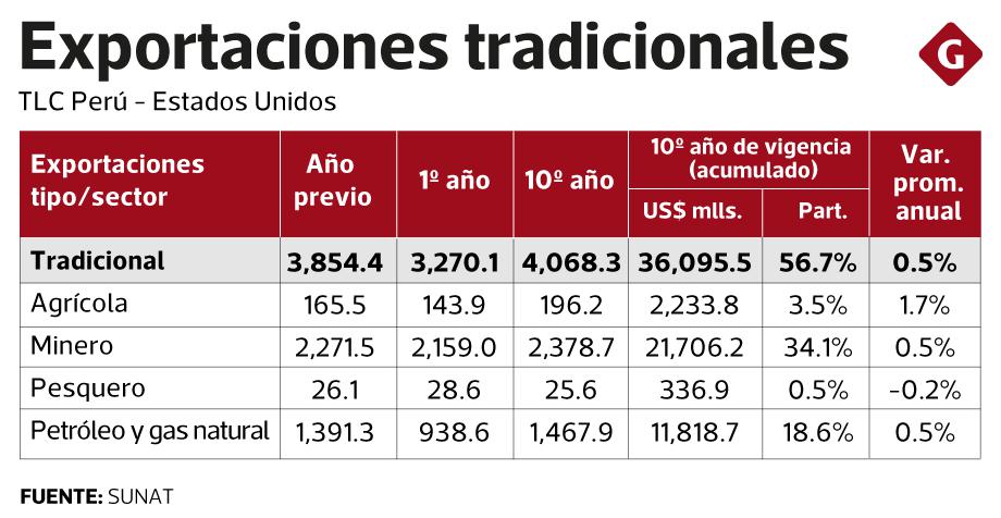 Durante la vigencia del tratado, las exportaciones tradicionales de Perú representaron el 56.7% de los envíos totales. Dichas exportaciones crecieron, en promedio, 0.5% anual, en tanto que los envíos no tradicionales (el 43.3% de los envíos totales) registraron una tasa promedio de crecimiento de 7.3%.