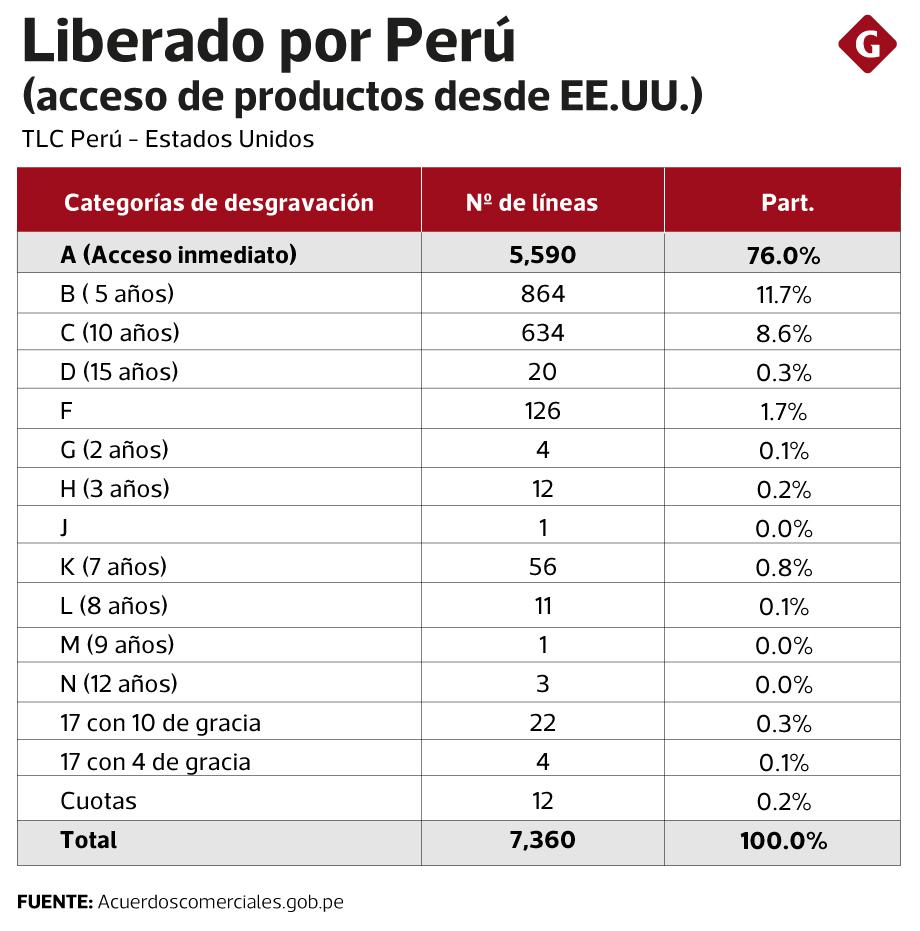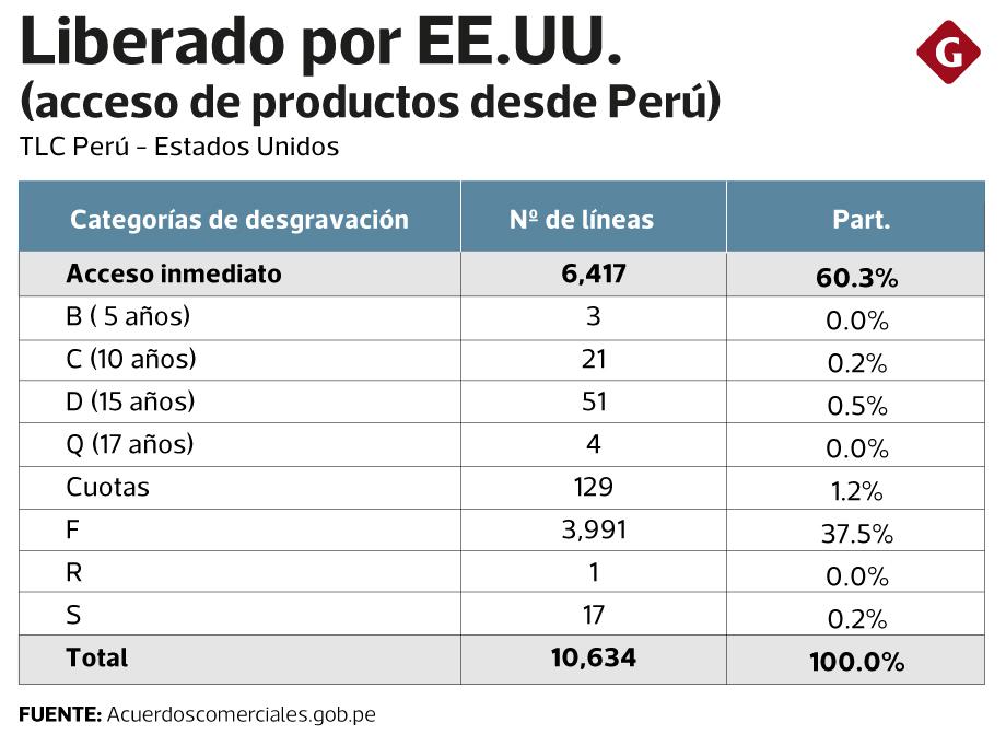 Para el Perú, este acuerdo significa el acceso libre de gravamen a 10,634 líneas de productos de Estados Unidos: 6,417 con la entrada en vigencia del tratado, y las restantes de forma progresiva. A los Estados Unidos les permite acceder a 7,360 líneas de productos peruanos libres de gravámenes.