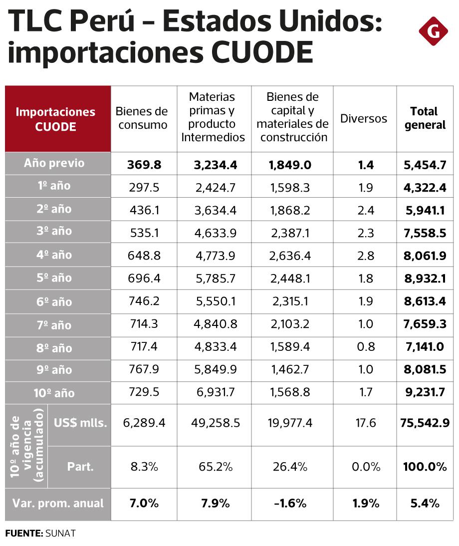 Así, para el Perú las importaciones en el marco de este TLC han representado el 54.3% del intercambio comercial durante los últimos 10 años, mientras el 45.7% correspondió a las exportaciones.