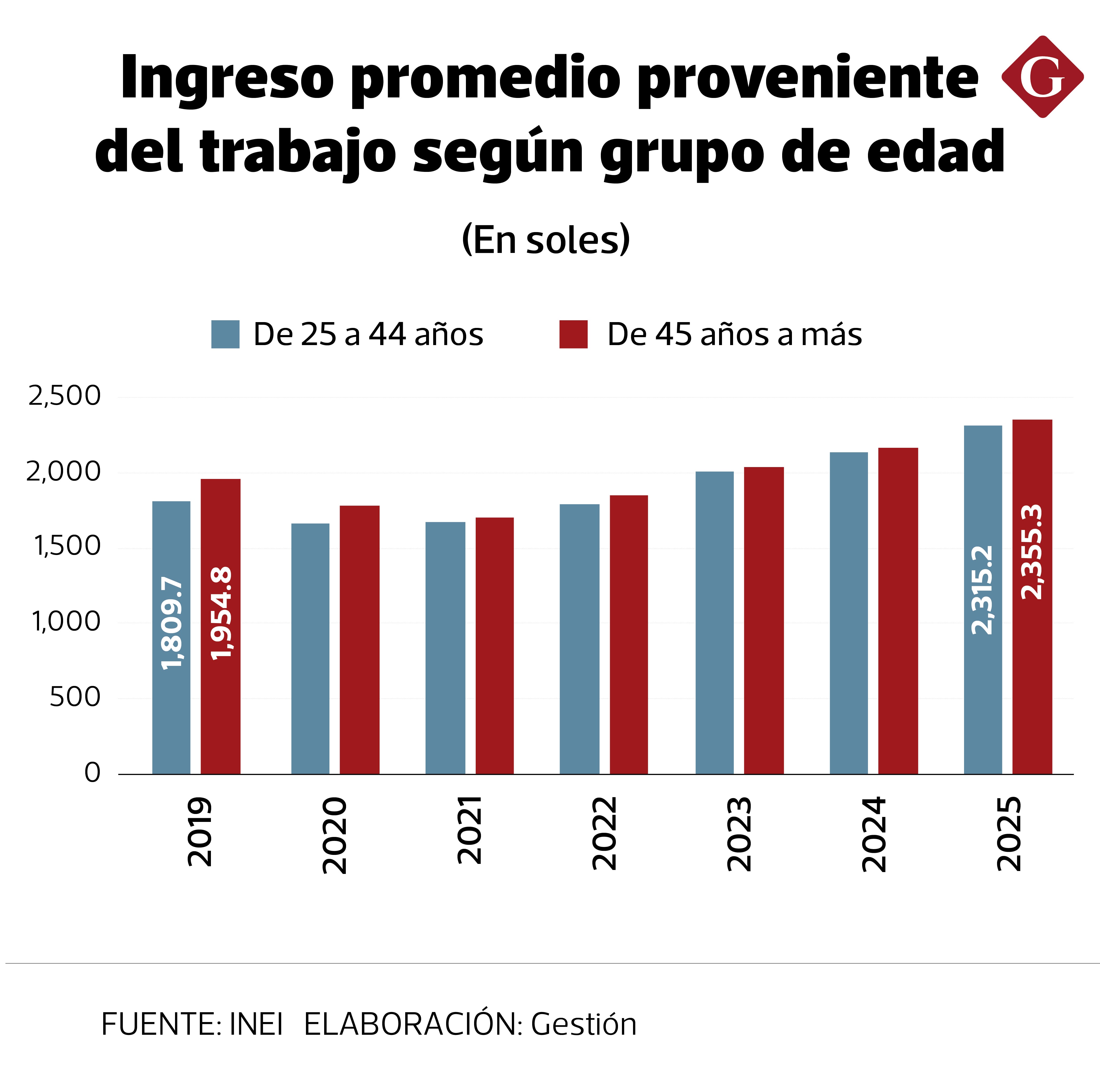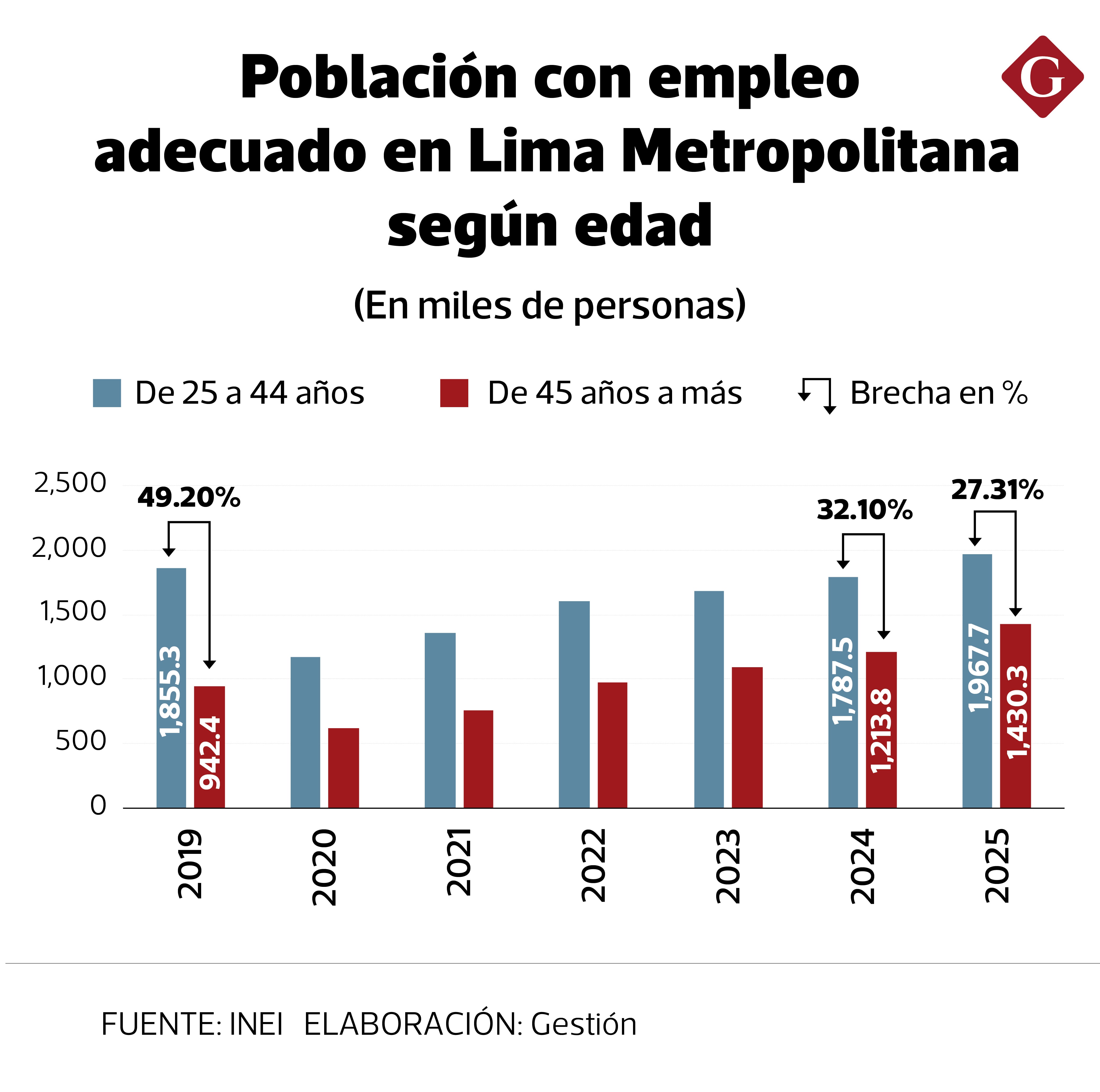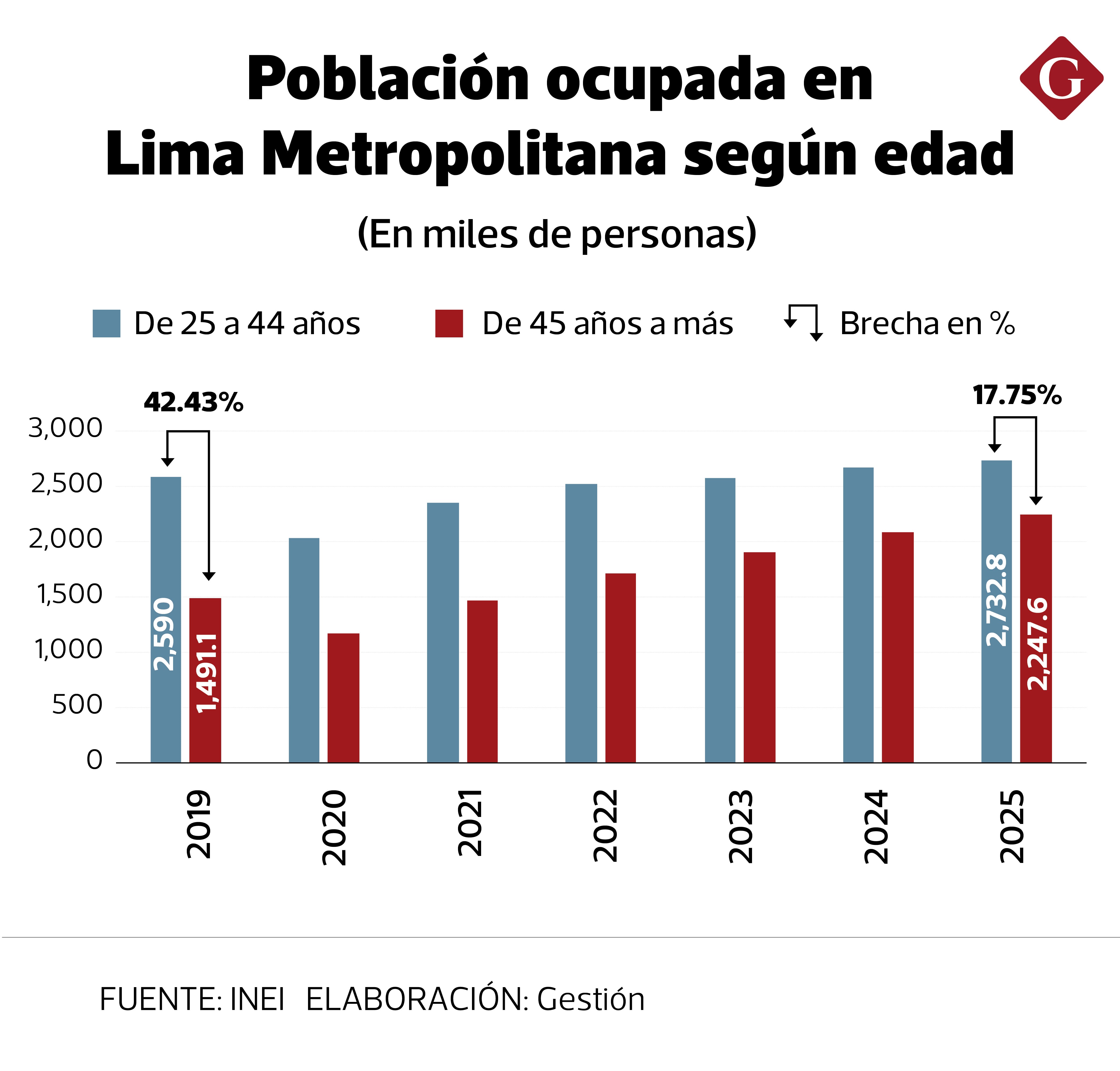 Entre el 2019 y el 2025, los trabajadores de 45 años a más subieron en un 50%, hasta superar los 2.2 millones, mientras que en el ámbito de 25 a 44 años lo hizo en un 5.5% (hasta los 2.7 millones). Esto ocasionó que la otrora brecha de 42% se reduzca en más de la mitad hasta menos de un 18%.