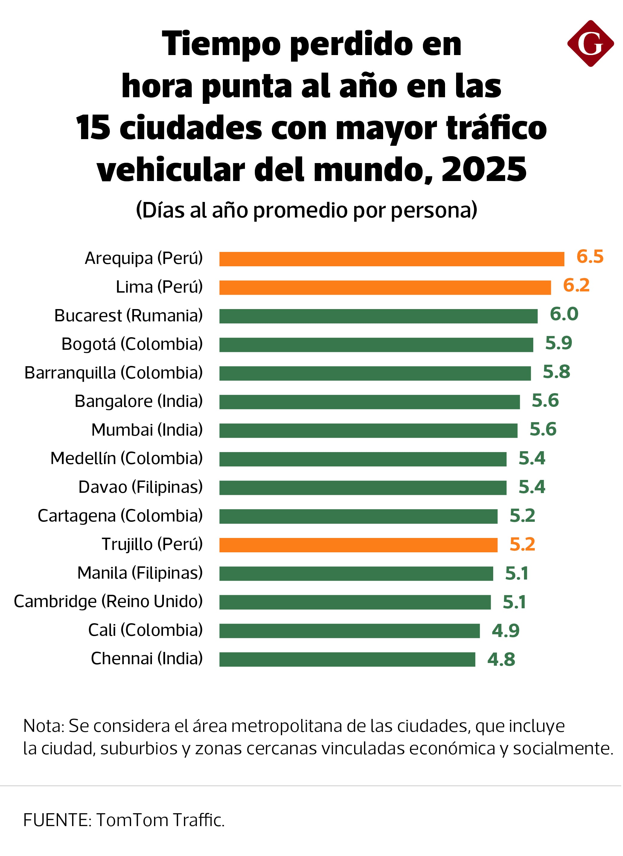 Según TomTom Traffic, en ambas ciudades, el pasajero promedio pierde más de 6 días al año atrapado en el tráfico en hora punta, 80% más que en Santiago de Chile (3.5 días). Trujillo también figura entre las ciudades con mayor tráfico. El año pasado, empató con Cartagena en el puesto 10 a nivel mundial, con un promedio de 5.2 días perdidos anuales.