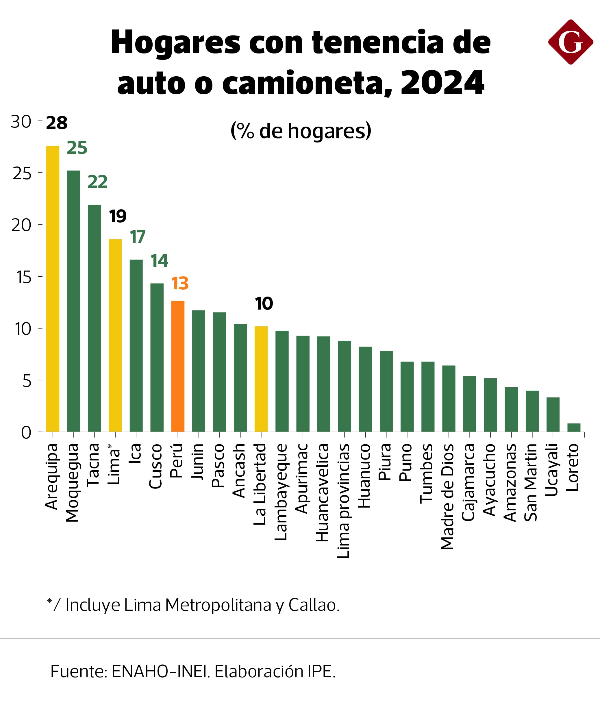 Mientras tanto la tenencia de vehículos particulares continúa expandiéndose. En el 2024, la proporción de hogares con autos o camionetas a nivel nacional alcanzó 12.6%, con niveles más marcados en ciudades donde el tráfico ya es elevado. Por ejemplo, Arequipa y Lima Metropolitana y Callao registraron tasas de tenencia de 27.6% y 18.6%, por encima del promedio nacional.